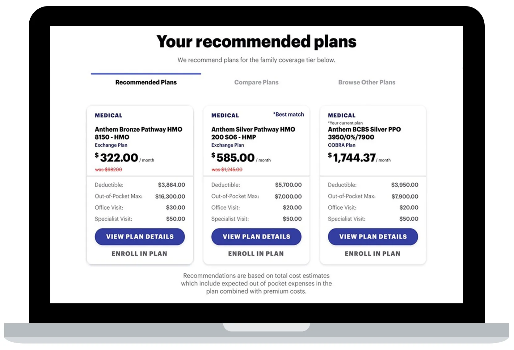 Functionality of the COBRA Decision Enablement (DE) Tool: ThrivePass's COBRA DE tool offers a guided experience that provides personalized recommendations based on individual needs. It simplifies the comparison between COBRA continuation coverage and recommended Marketplace plans through a single, user-friendly portal. This integrated approach helps users make educated decisions by presenting clear, comparative insights into costs and coverage options together with a plan recommendation based on the responses an individual provides to several questions.
